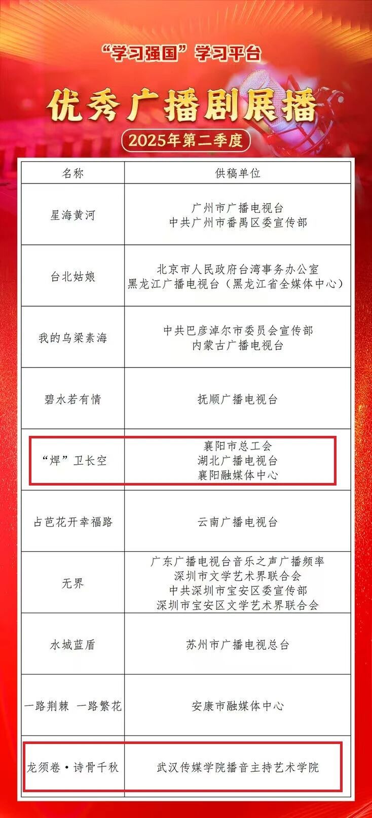 (通讯员:许维胜)近日,武汉传媒学院播音主持艺术学院师生依托省级一流课程《影视配音创作》深度参与创作的广播剧《“焊” 卫长空》,与学院原创广播剧《龙须卷》一同在 “学习强国” 平台获推荐展播。其中,《“焊” 卫长空》以 “大国工匠” 孙红梅为原型,讲述她二十年如一日攻克航空发动机焊接技术的事迹;《龙须卷》则以沉浸式声音剧场再现唐宋诗人的精神史诗。